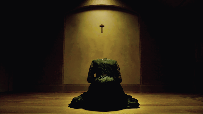 fervently in a dim room, walls bare but for a crucifix. Bent so